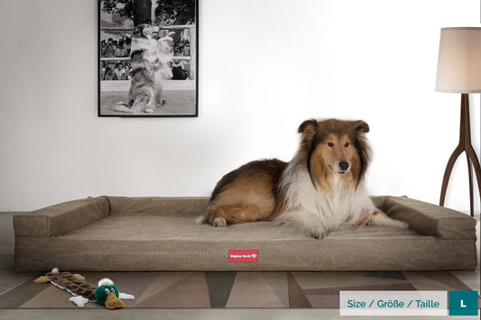Introducing the deluxe, memory foam dog bed sofa by Mighty Bark. This sofa dog bed features a luxurious high quality fabric outer, innovative Memo-Bounce mattress & bolster, pillow sides with bolster back, machine washable & removable outer and a stain resistant protective treatment.
