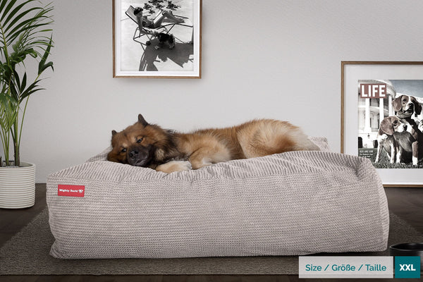 This loveable crash pad style dog bed by Mighty Bark is one comfortable place to be. Designed for dogs who have a penchant for human beds. This dog bed features a raised design, luxurious high quality fabric outer, innovative Memo-Bounce filling, machine washable & removable outer, a stain resistant protective treatment, an anti-slip base and a decorative top stitch.